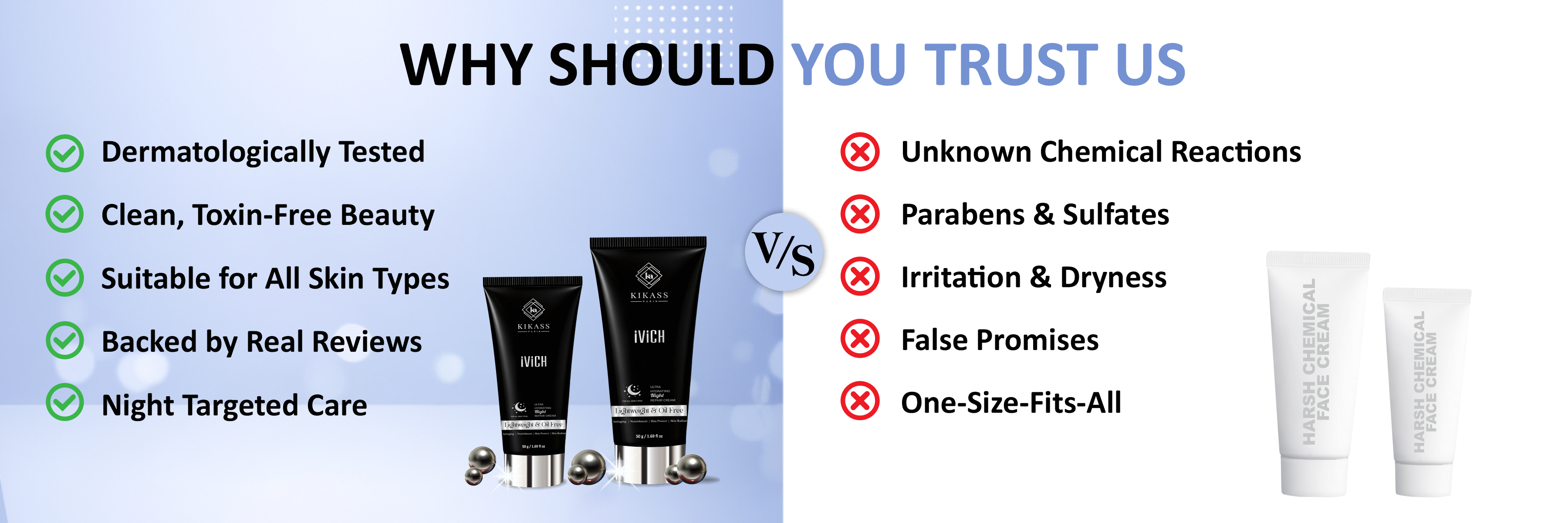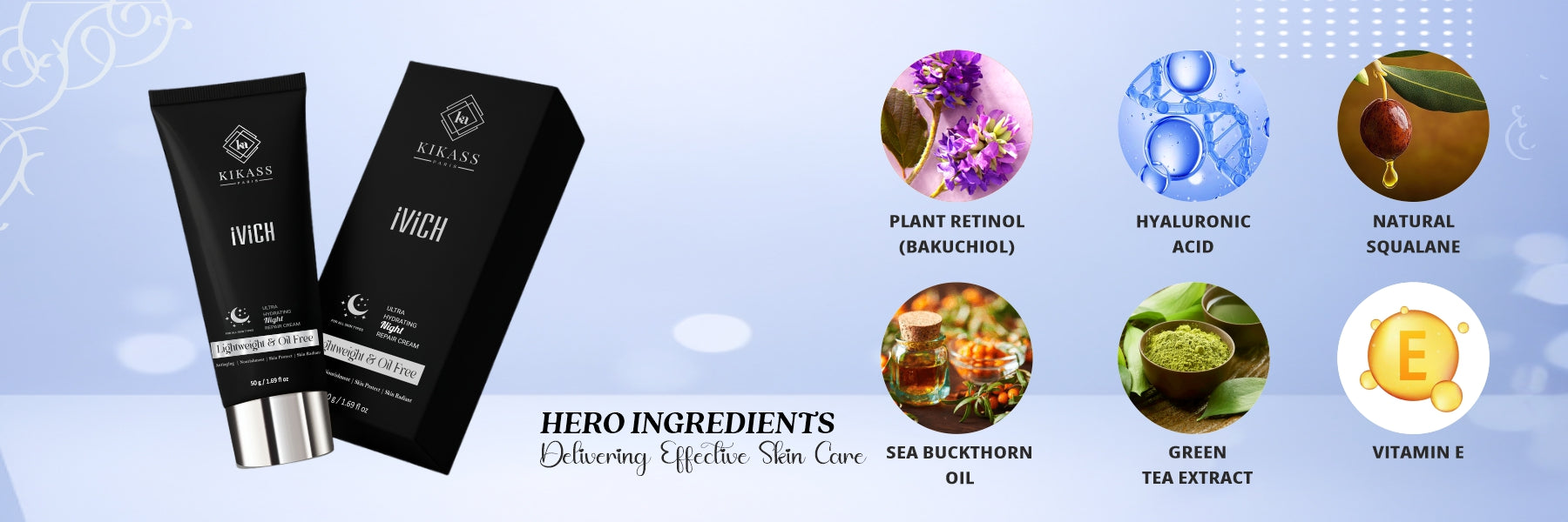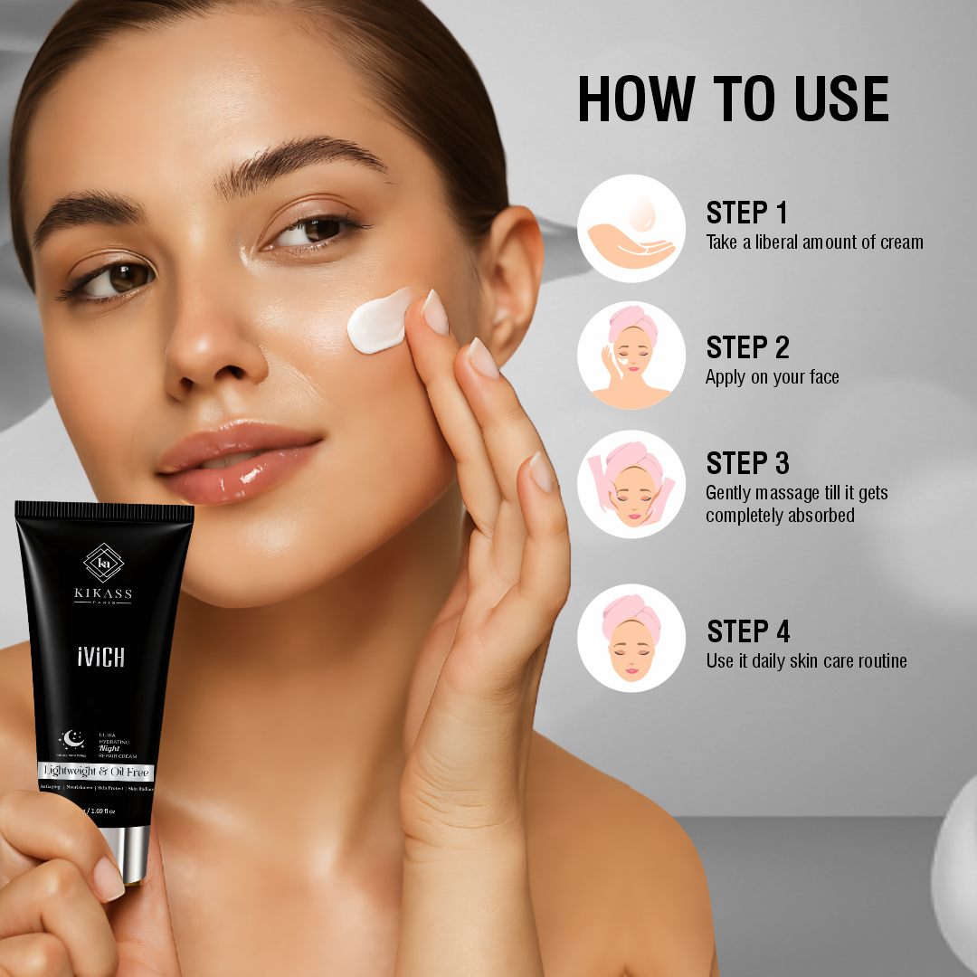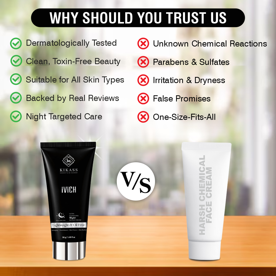 iViCH Ultra Night Repair Cream is more than just a moisturizer, it's a nighttime skin treatment, created with precision skin science and enriched with nature’s healing power. Let your skin indulge in the science of beauty while you rest.