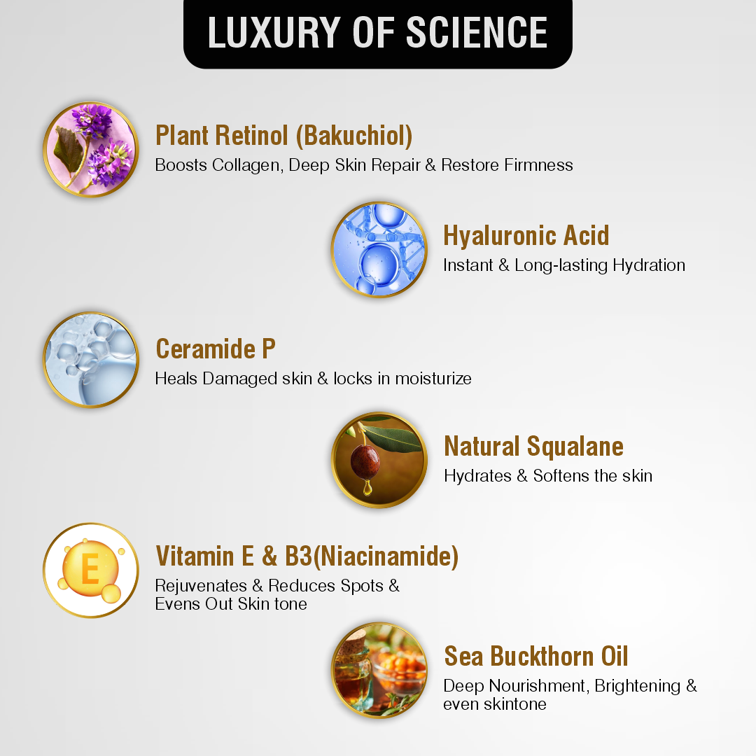 Enriched with main essential ingredients are Plant Retinol (Bakuchiol), Hyaluronic Acid, Natural Squalane, Green Tea Extract, Vitamin E and Sea Buckthorn Oil, this luxurious cream works in harmony with your skin’s overnight repair cycle. As you sleep, your skin goes into recovery mode repairing damage, restoring balance, and rebuilding strength.